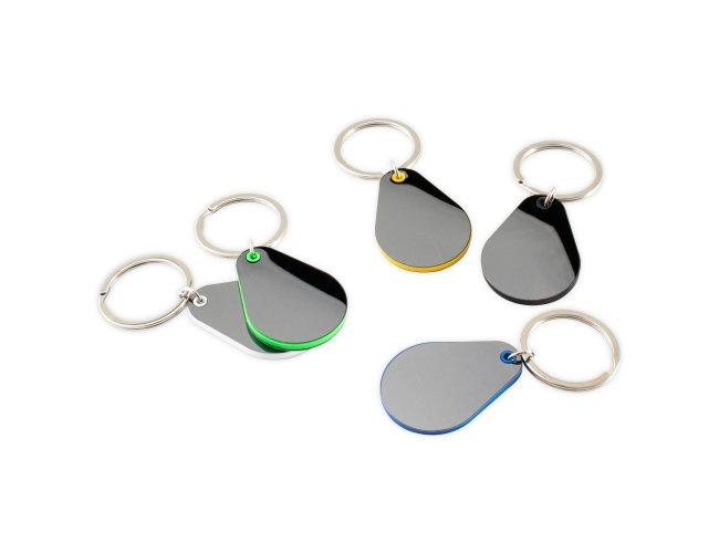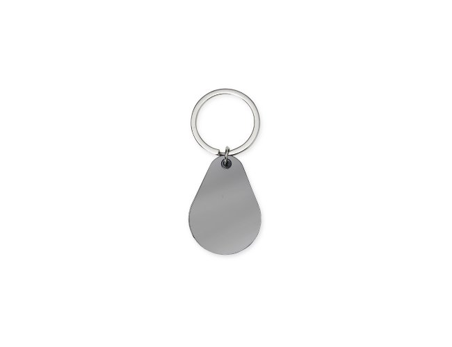 Chaveiro com detalhe plástico e chapa metálica grafite, personalizável frente e verso.