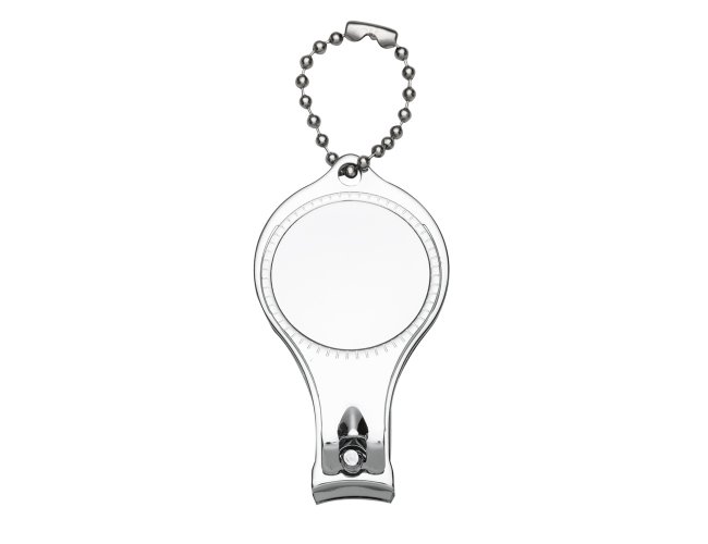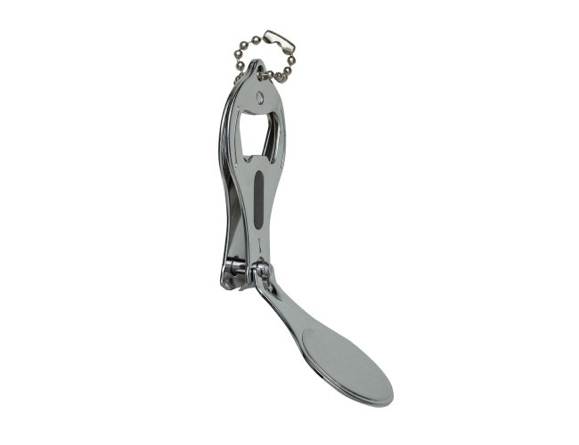 Chaveiro metal 3 em 1: abridor, cortador e lixa. Parte central circular ideal para gravações, detalhe de traços no contorno circular. Lado frontal com detalhes em relevo nas laterais e pequeno círculo acima do abridor. Para utilizar o cortador basta rotacionar a peça cirular e levantá-la. Acompanha correntinha.