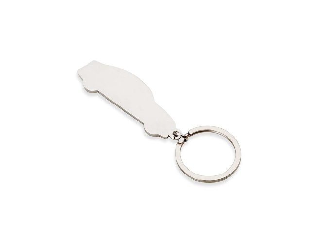 Chaveiro metal formato carro com detalhes preto em relevo e verso espelhado.