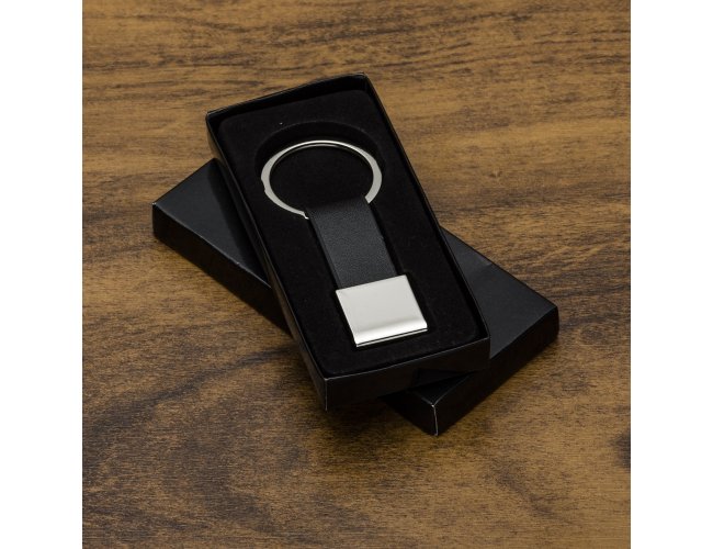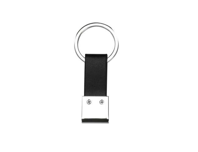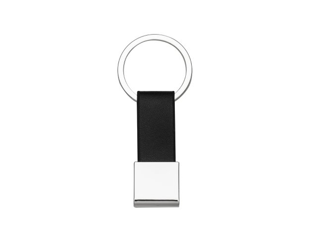 Chaveiro de metal quadrado com alça de couro sintético. Frente lisa e verso com detalhe do parafuso.