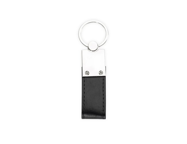 Chaveiro em metal brilhante com alça de couro sintético, frente e verso lisos e argola de ferro niquelado.