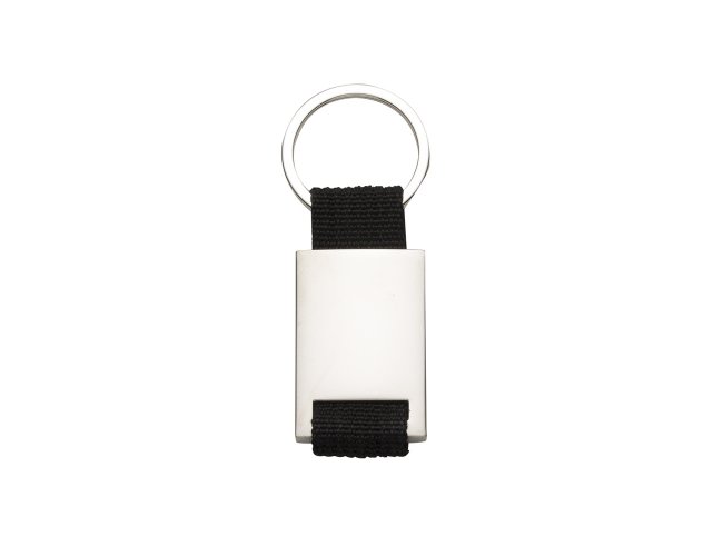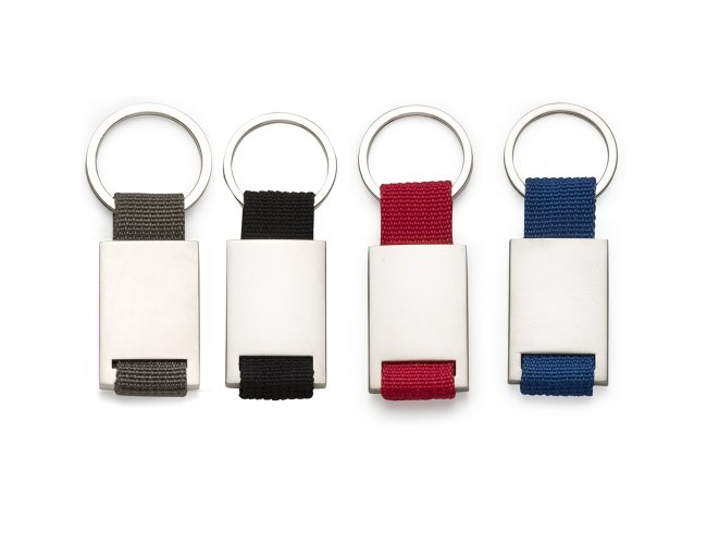 Chaveiro de metal com detalhe colorido em nylon. Metal liso e fosco de ambos lados.