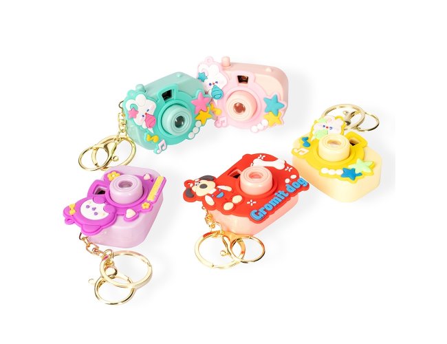 Chaveiro em plástico no formato de câmera, com detalhes decorativos de animais. Possui projeção de oito figuras de animais, acionada por botão, além de argola e mosquetão em metal. Acompanha três baterias L736 já embutidas.