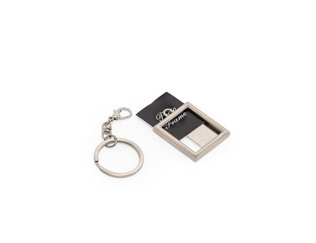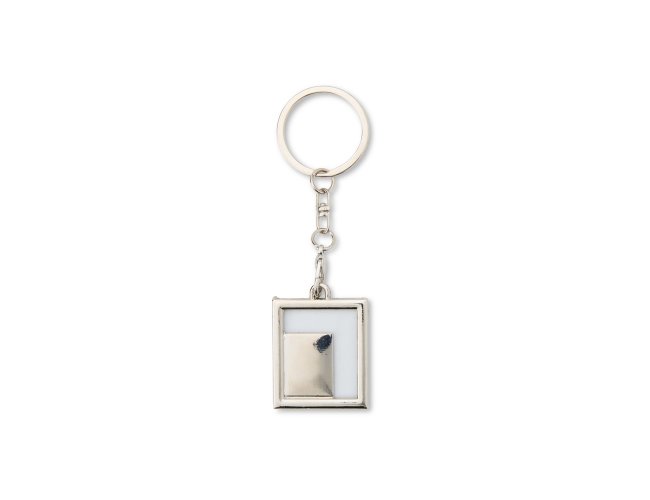 Chaveiro porta-foto em inox com formato retangular. Possui capa protetora plástica removível e corrente com gancho fixo em uma extremidade e argola na outra.