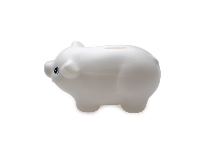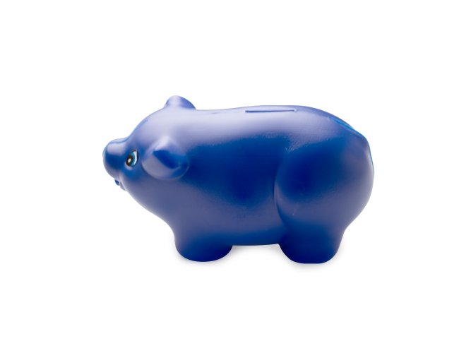 Cofre em formato de porco de plástico. O cofre possui abertura na parte superior para inserção de dinheiro ou moedas, e para abri-lo, é necessário cortá-lo.