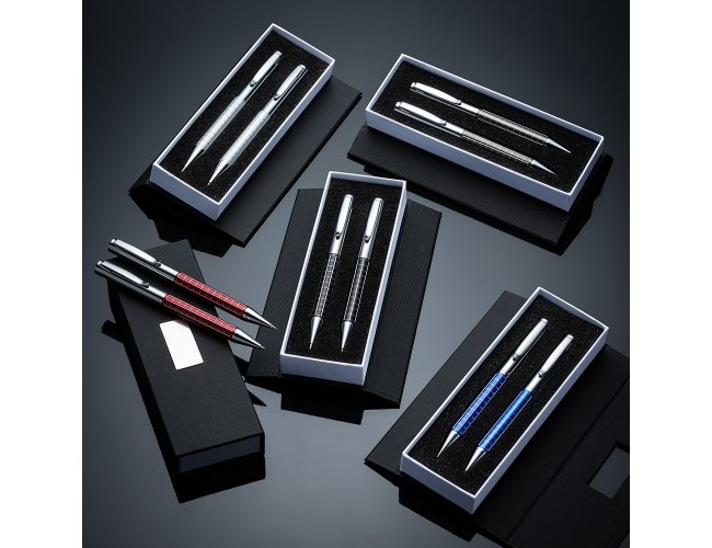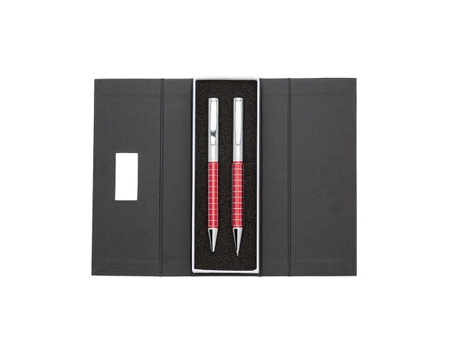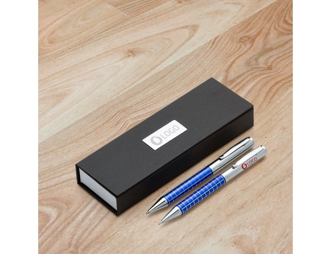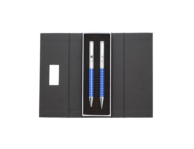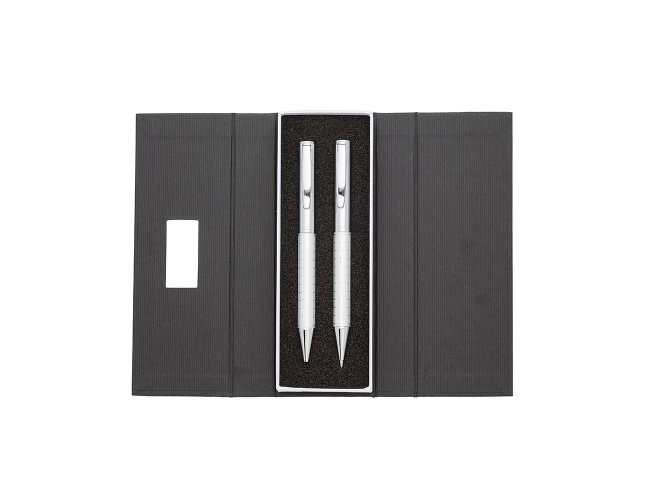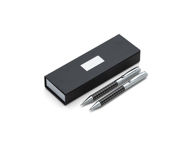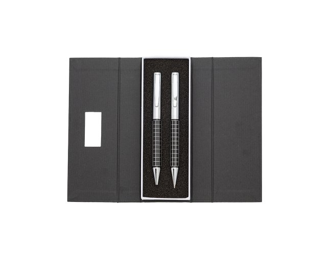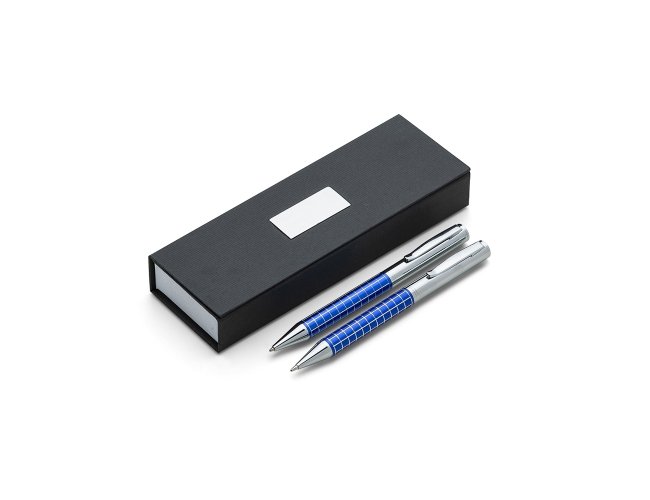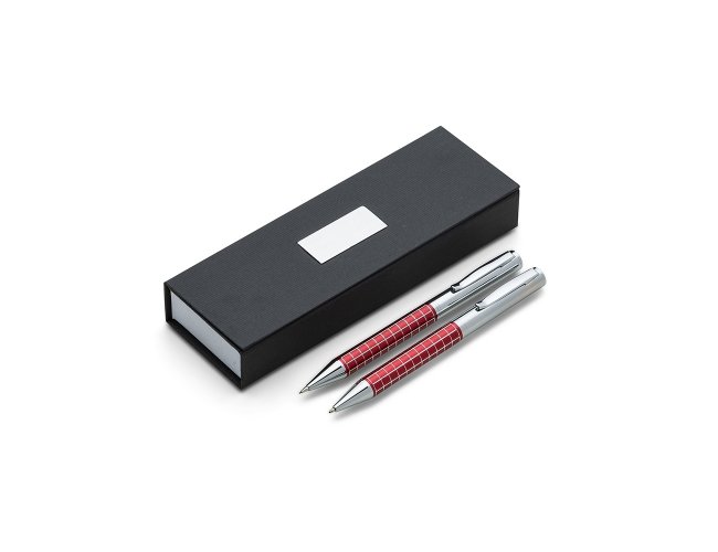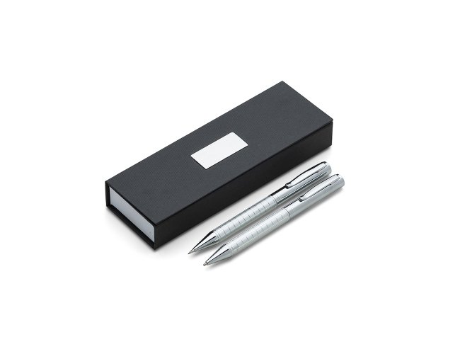 Kit caneta e lapiseira de metal em estojo papelão com placa de metal(parte interna do estojo revestida com espuma). Caneta e lapiseira prata com detalhes coloridos e quadriculados, clip metal com anel superior na ponta e dois anéis centrais e acionam por giro.