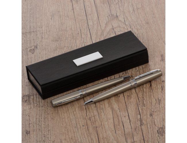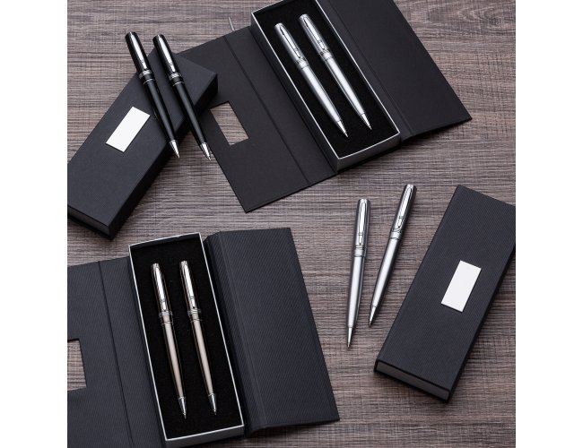Conjunto caneta e lapiseira em estojo de cartonagem com placa central para personalização. Caneta/Lapiseira metal inteira colorida com detalhes prata, clip metal com duas ?linhas? e na ?ponta? superior detalhe de uma linha no meio. Possui três anéis abaixo do clip, anel centralizado e anel inferior e acionam por giro. Estojo revestida com espuma na parte interna.