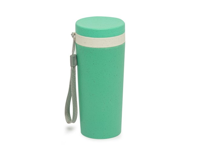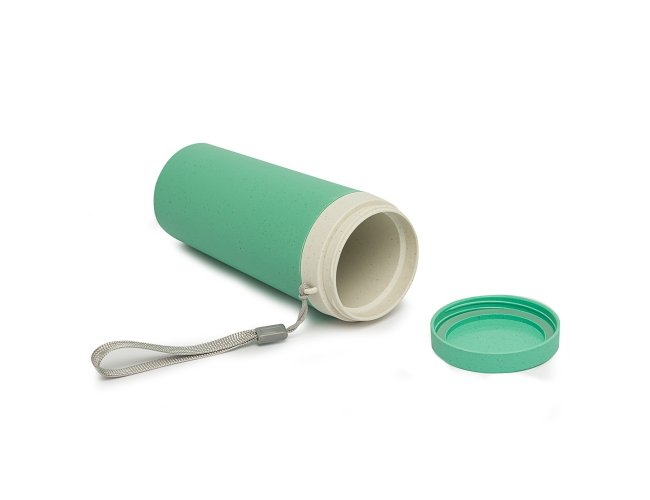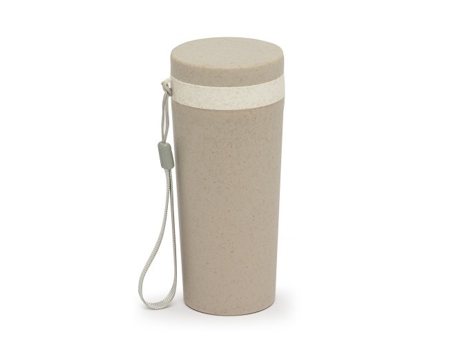 Copo isotérmico fibra de bambu 350ml com parede dupla e alça. Copo produzido em Polipropileno livre de BPA, possui uma tampa de vedação rosqueável e alça de nylon (removível) para transporte. Conserva a temperatura interna durante um período de 1 à 2 horas, mas não dispõe de isolamento térmico. O copo pode ser levado a lava-louças, geladeiras e micro-ondas.