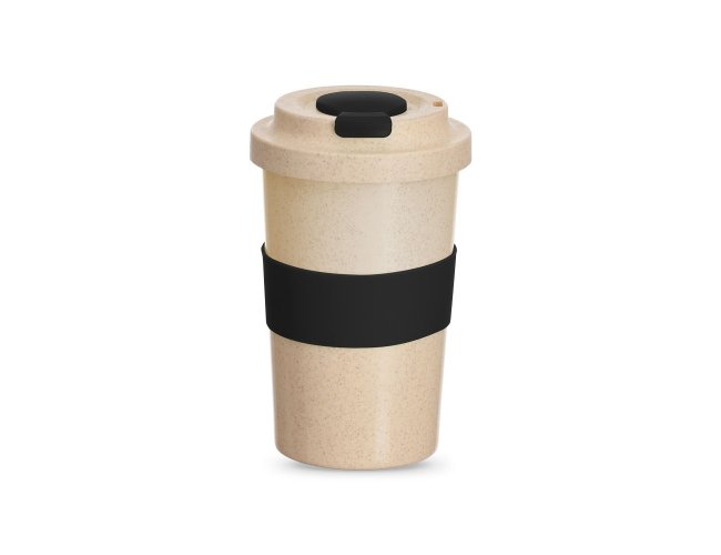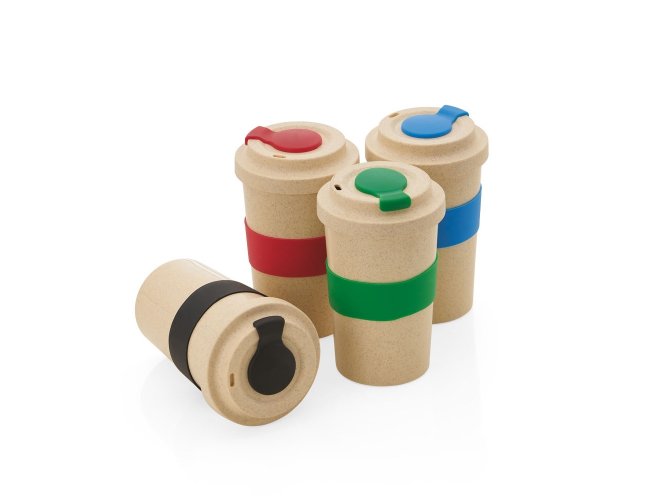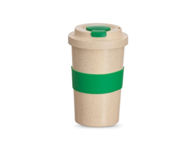Copo fibra de bambu 450ml com tampa rosqueável. Possui luva colorida e tampa protetora para o bocal ambos em silicone.