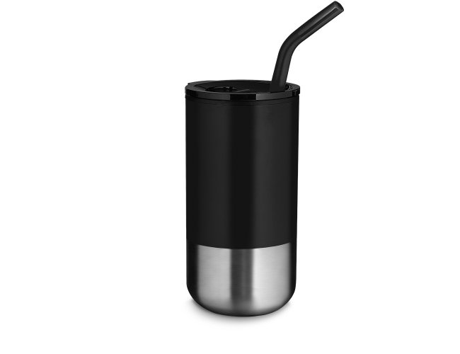 Copo em inox fosco com canudo removível, com capacidade de até 500ml. Parte interna revestida com plástico.