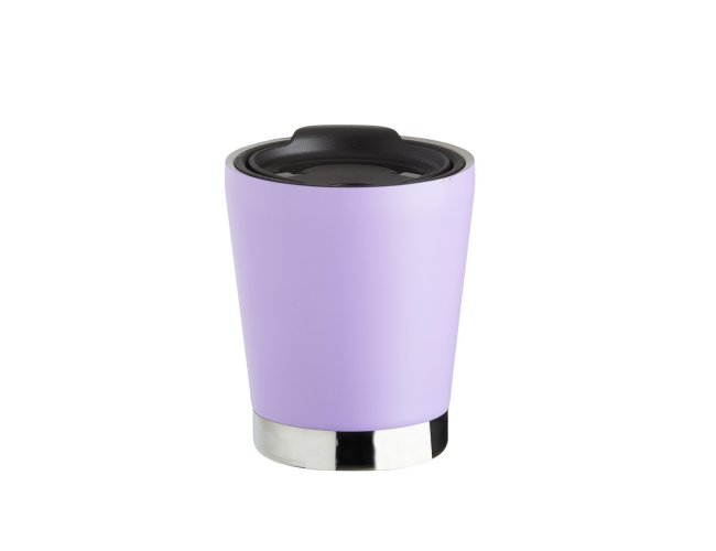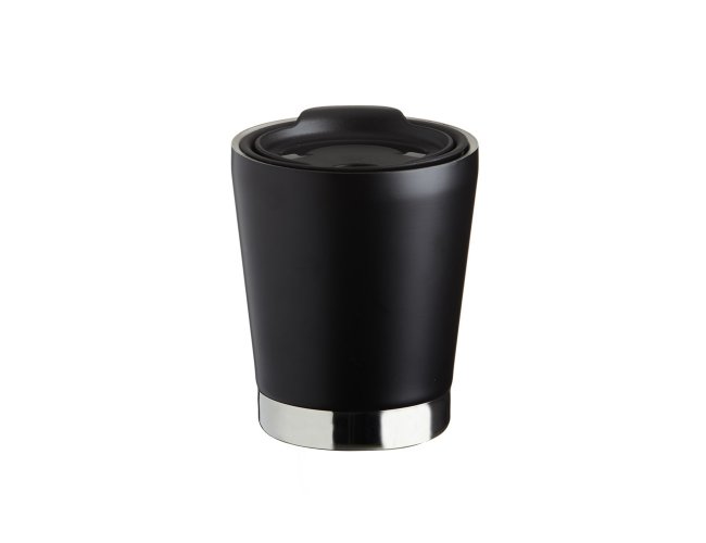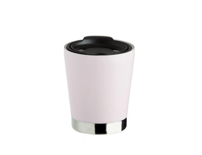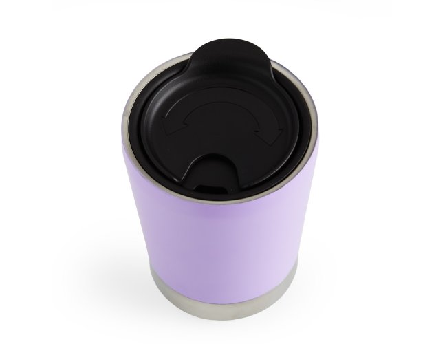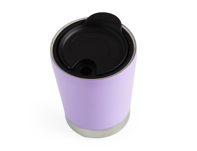 Copo inox 304 parede dupla com capacidade de 300ml, possui tampa plástica de encaixe com acesso ao bocal e área para canudo (não acompanha).