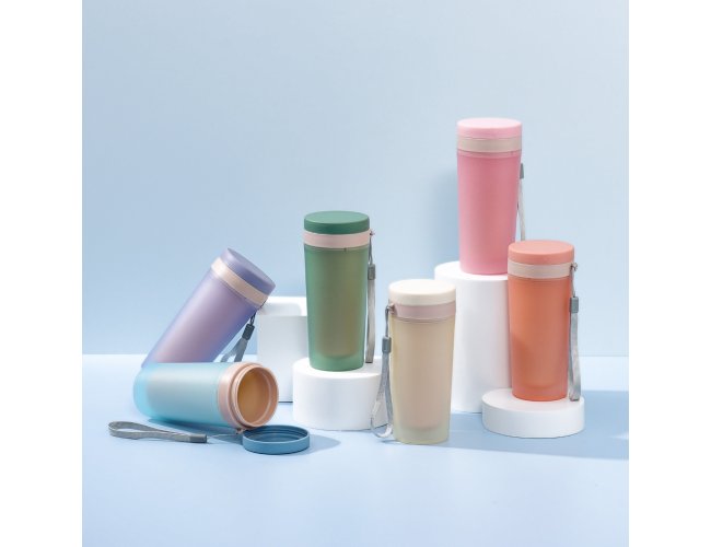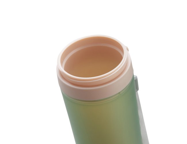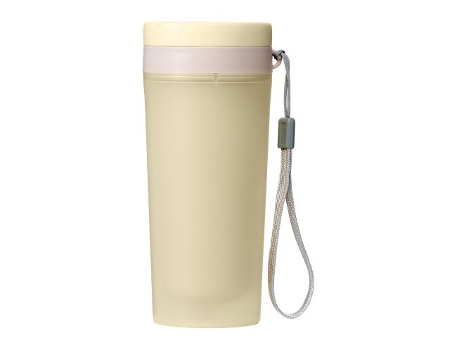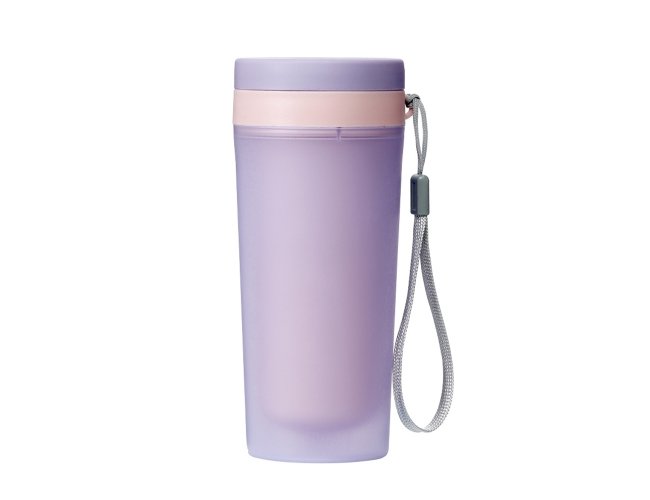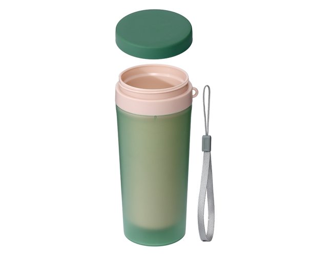 Copo isotérmico de plástico polipropileno com capacidade para 300ml livre BPA. Acompanha tampa rosqueável e alça de nylon para transporte.