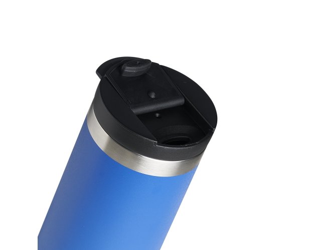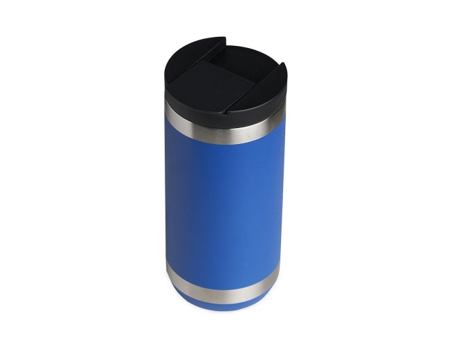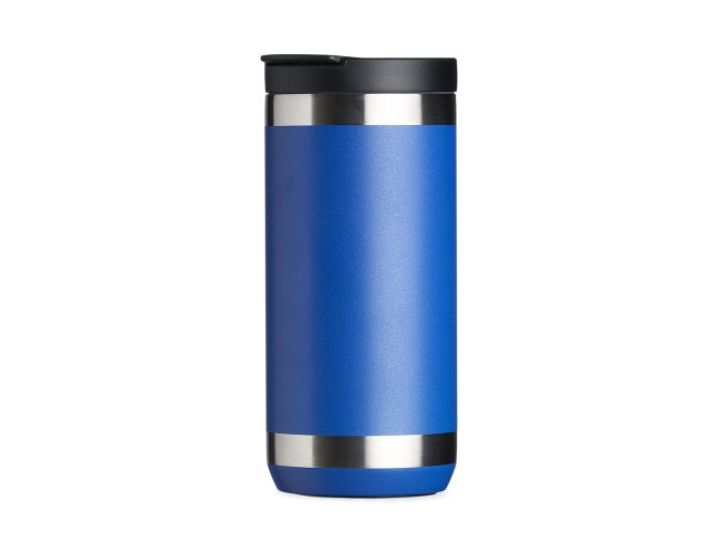 Copo térmico de inox feito de parede dupla com capacidade para 350ml. Contém tampa plástica com bocal e trava de segurança.