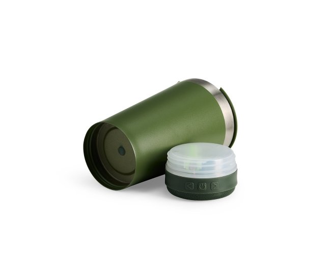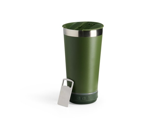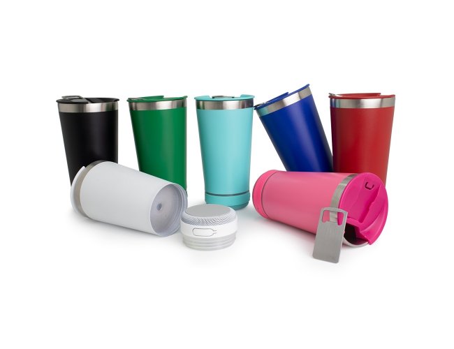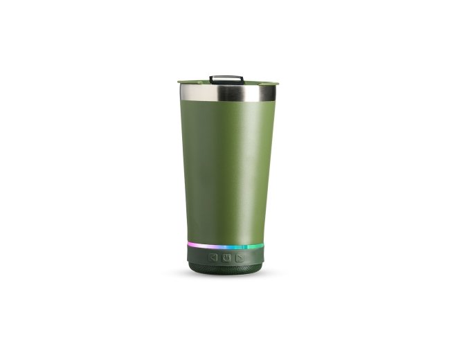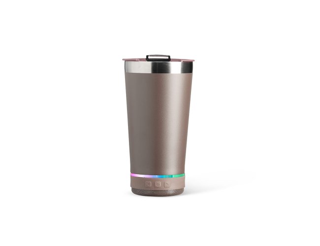 Copo térmico de inox com caixa de som e capacidade 400ml. Contém tampa com abridor. Caixa de som possui botão para ligar/desligar, botões para aumentar diminuir volume/ avançar e retroceder faixas. Operante no modo bluetooth. Acompanha cabo USB Tipo-C. Obs.: A caixa de som não é a prova dágua, para a higienização do copo é necessário desrosquear a caixa de som para remove-la.
