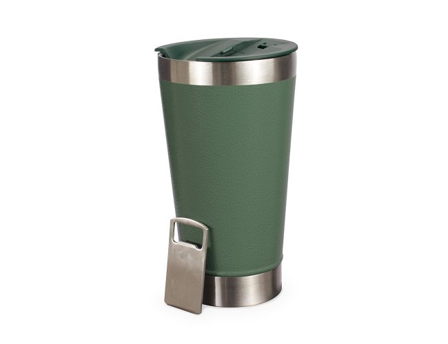 Copo térmico de inox com acabamento texturizado e capacidade 500ml, material livre de BPA. Contém tampa com abridor.