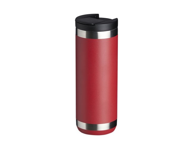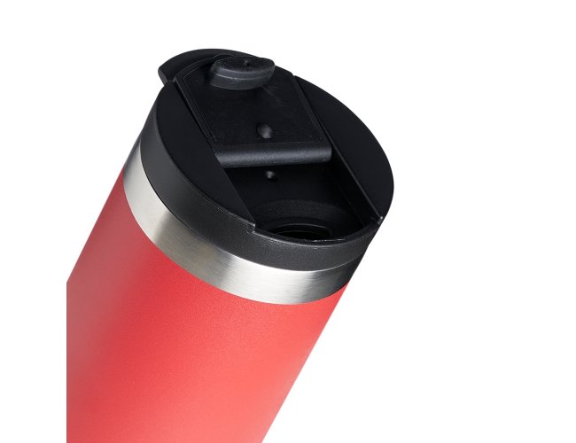 Copo térmico de inox feito de parede dupla com capacidade para 550ml. Contém tampa plástica com bocal e trava de segurança.