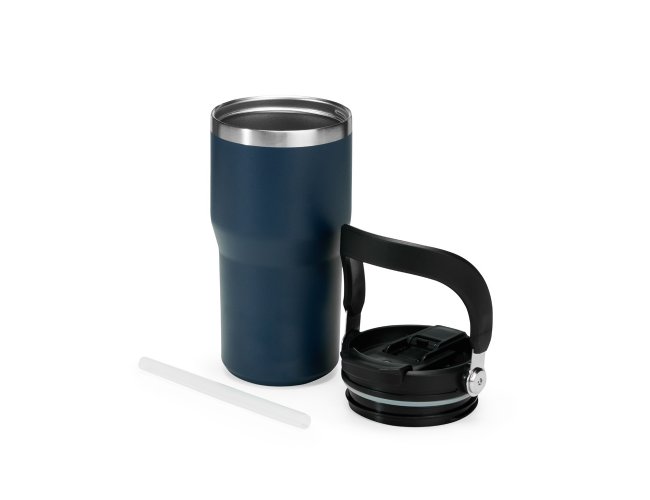 Copo térmico em inox com pintura eletrostática e capacidade máxima de 600ml. Conta com estrutura de parede dupla e vedação a vácuo que permite a conservação da temperatura de líquidos por mais tempo. Possui tampa plástica rosqueável com protetor para o bocal, bico flip, canudo interno removível e alça fixa para transporte.