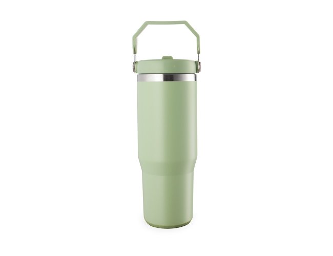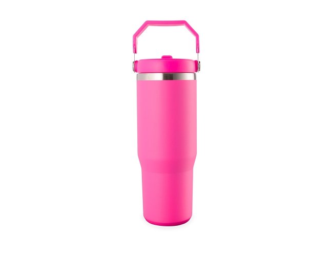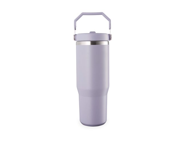 Copo térmico inox com a capacidade máxima de 800ml. Apresenta estrutura em parede dupla, tampa plástica rosqueável com vedação a vácuo com alça fixa em inox e uma camada em plástico, além de bico flexível. Acompanha canudo plástico para encaixe interno.