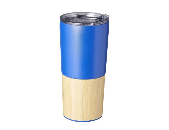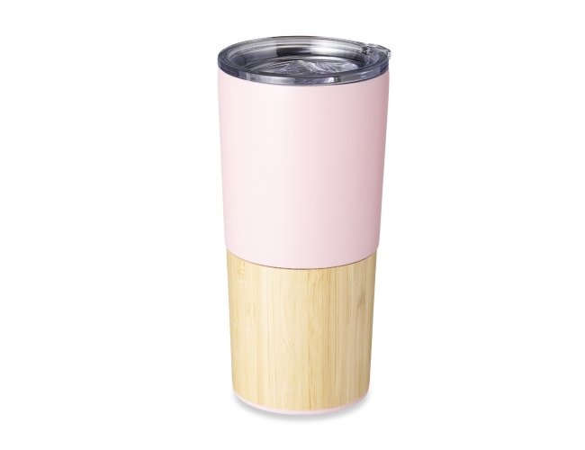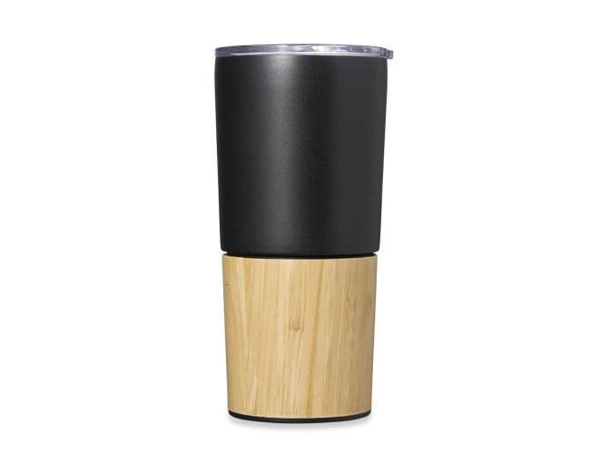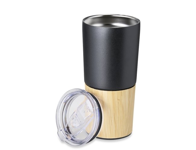 Copo térmico de inox 600ml com parede dupla e detalhe de bambu. Tampa com acesso ao bocal e trava de segurança.