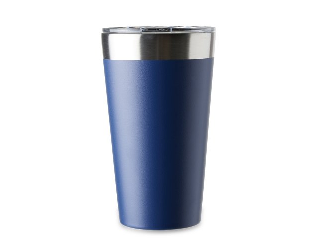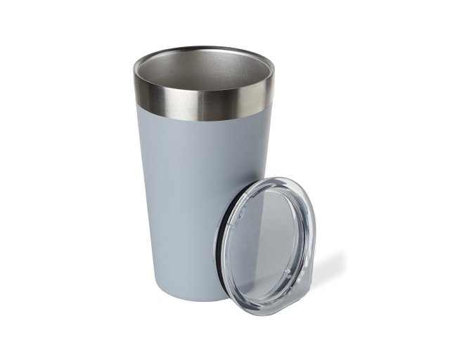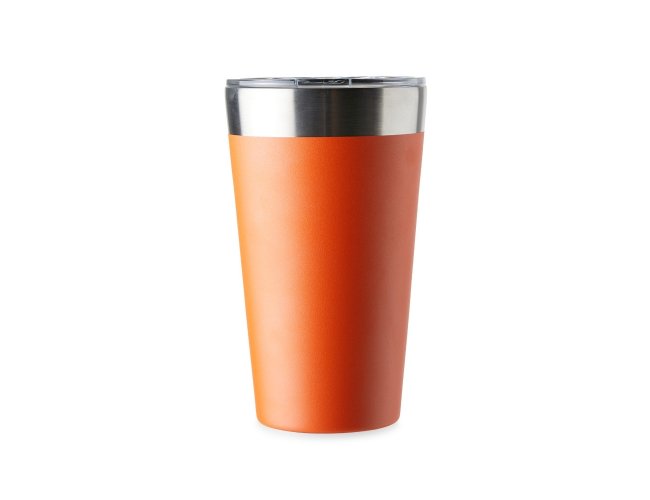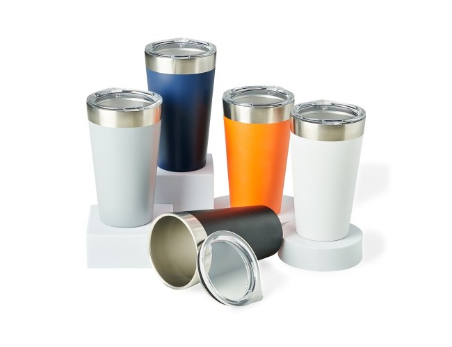 Copo térmico com capacidade de 473ml feito em inox com parede dupla, acompanha tampa acrílica de encaixe com bocal.