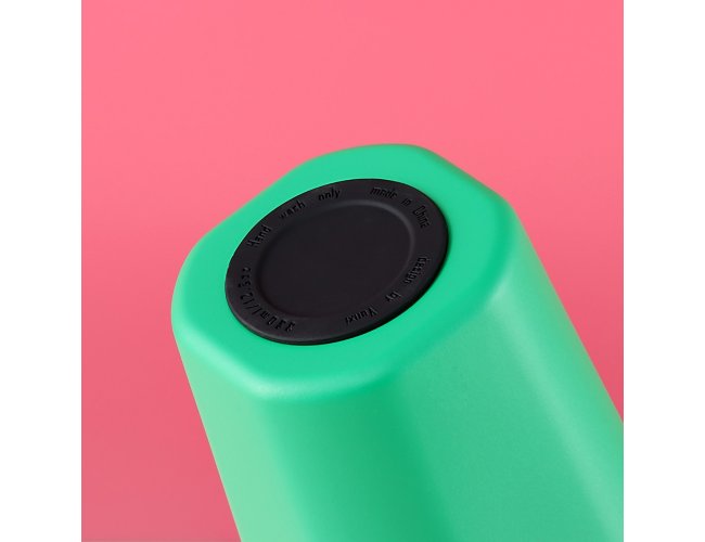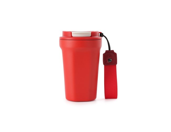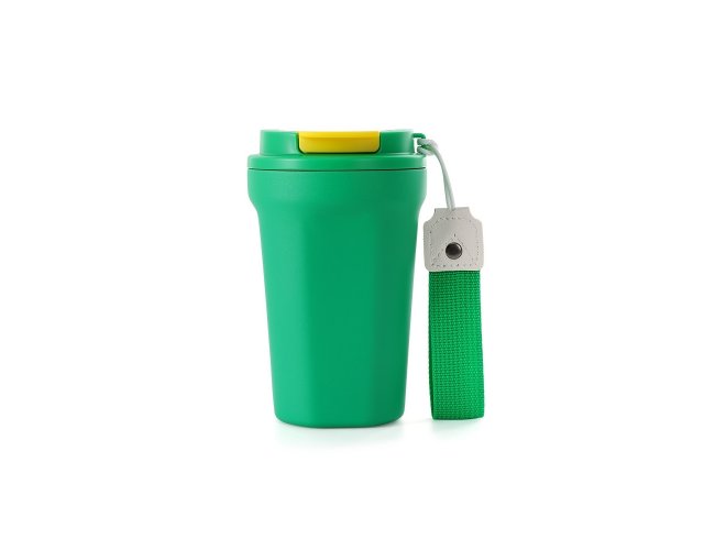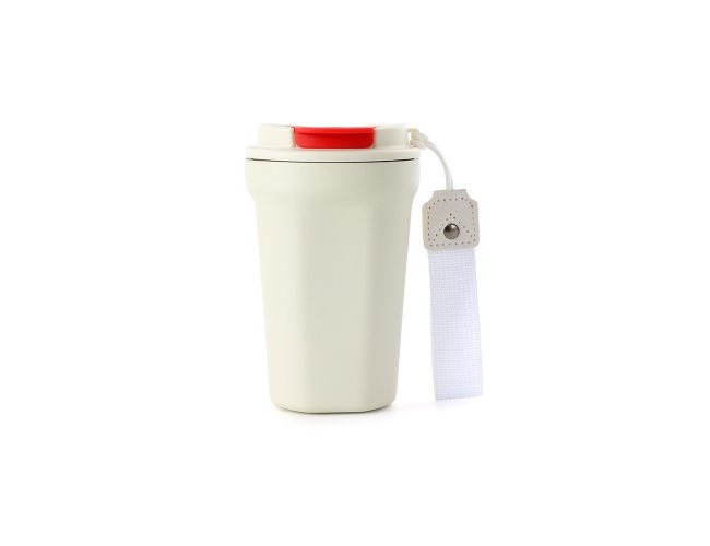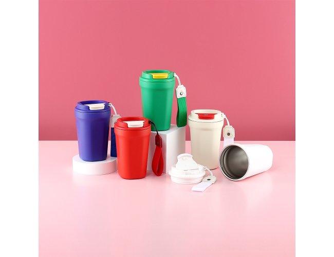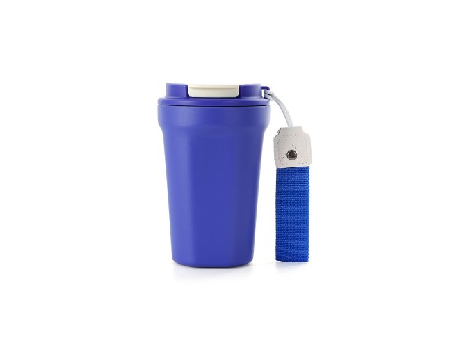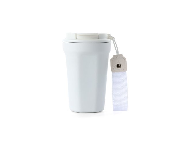 Copo térmico de inox 350ml com parede dupla, parte inferior com borracha antideslizante, tampa plástica rosqueável com abertura de bocal e alça de nylon para transporte com detalhe em couro sintético.