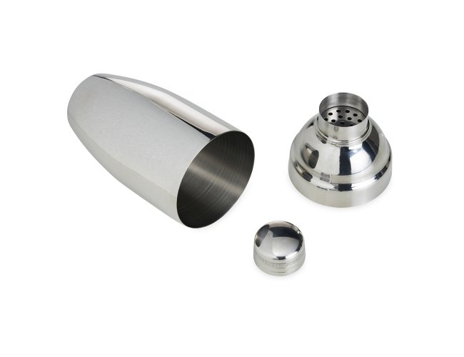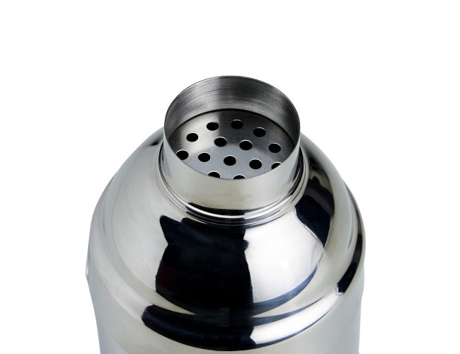 Coqueteleira de inox com capacidade para 750ml, contém tampa de pressão com peneira e tampa protetora.