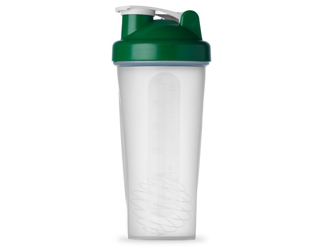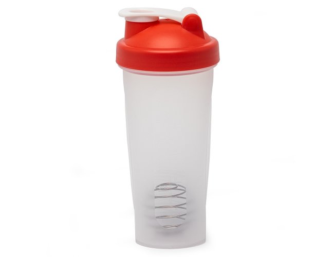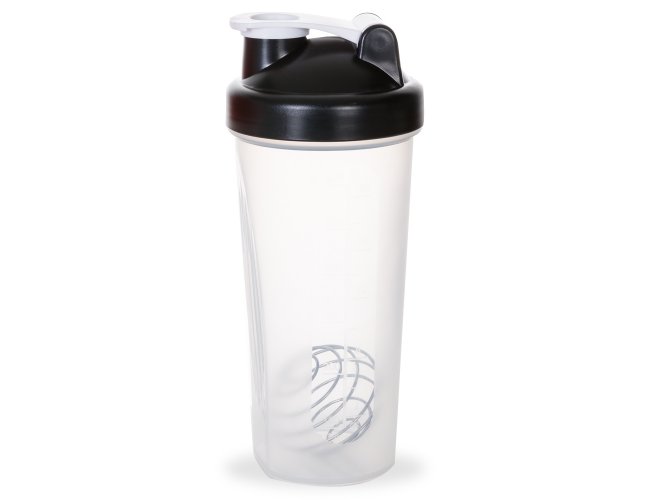 Coqueteleira para shake com capacidade de 600ml, copo com detalhes laterais em relevo e escala de medições em ml e oz. Tampa rosqueável com bocal e trava de segurança, acompanha misturador de mola.