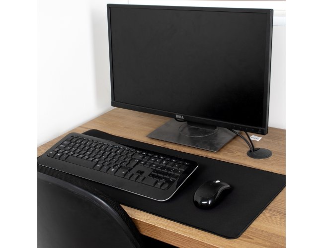 Desk pad em poliéster com bordas arredondadas e base antiderrapante em EVA, oferecendo uma combinação que confere mais conforto e precisão durante o uso, além de proteger superfícies planas contra danos e desgastes.