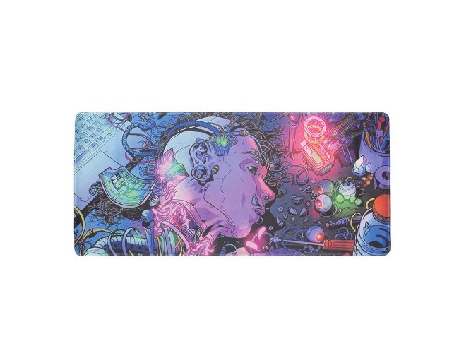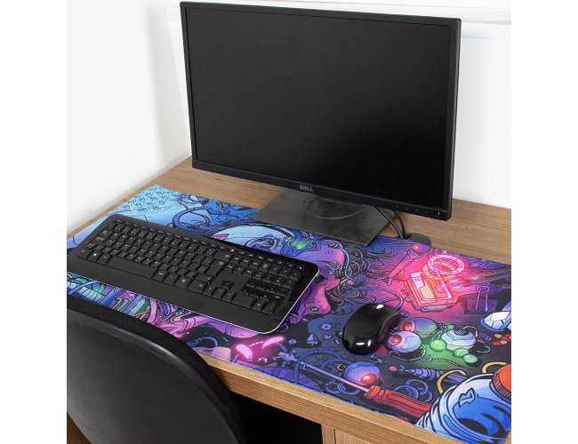 Desk pad flexível confeccionado em poliéster. Apresenta design leve com bordas arredondadas e estampa de estilo futurista. Conta também com base antiderrapante em EVA que ajuda a proteger superfícies contra danos e desgastes.