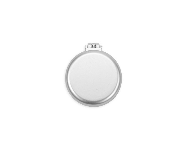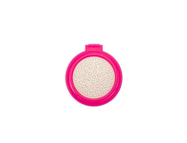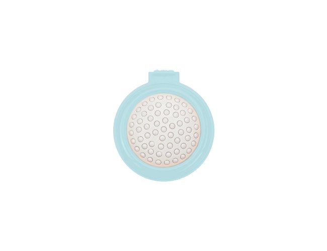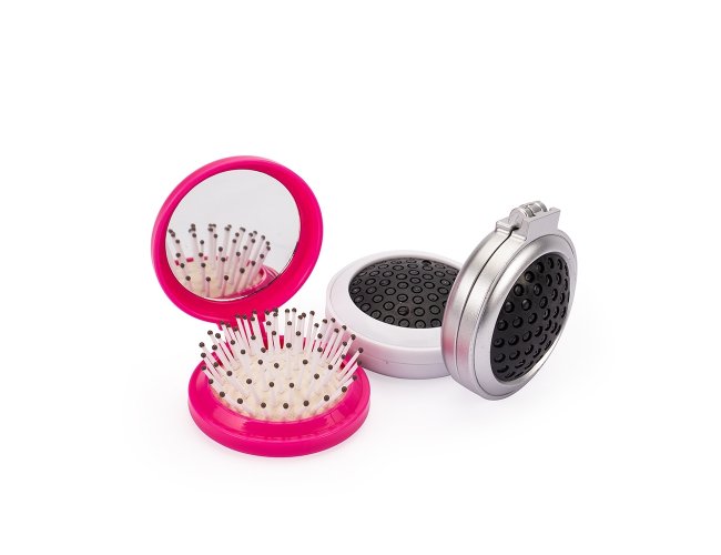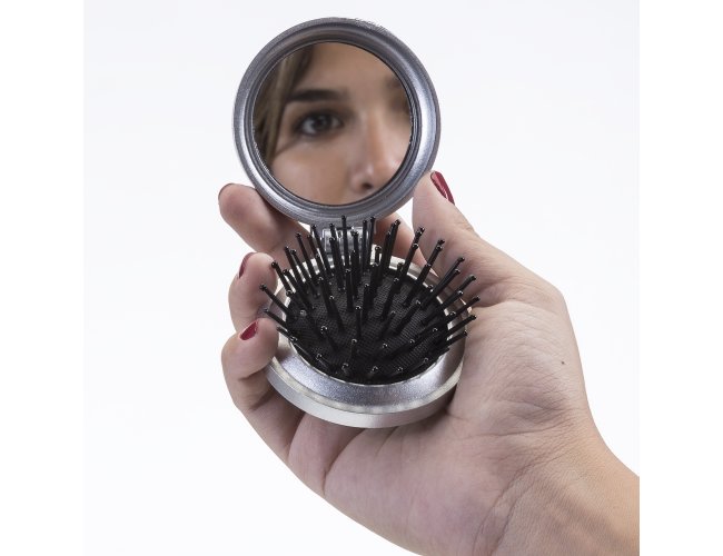 Escova com espelho redonda em plástico resistente. Parte superior plana e parte inferior emborracha com relevo, estando aberta a peça basta empurrar a parte emborrachada(lado de fora) para poder utilizar a escova.
