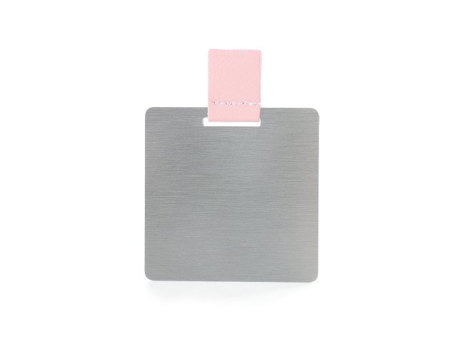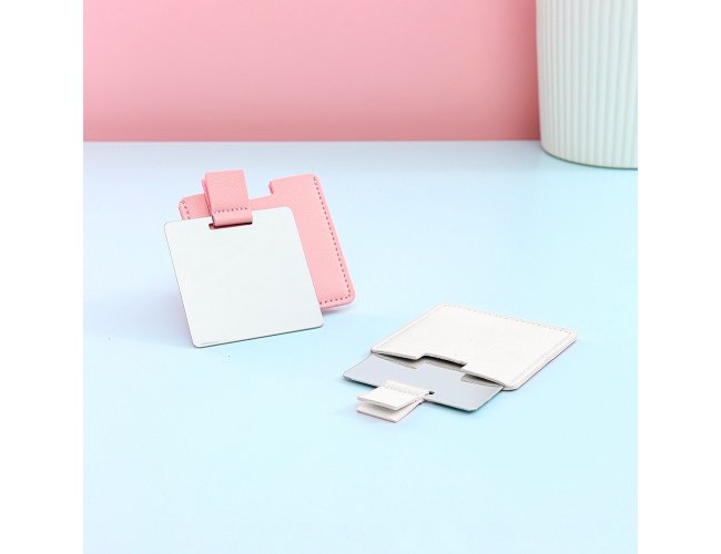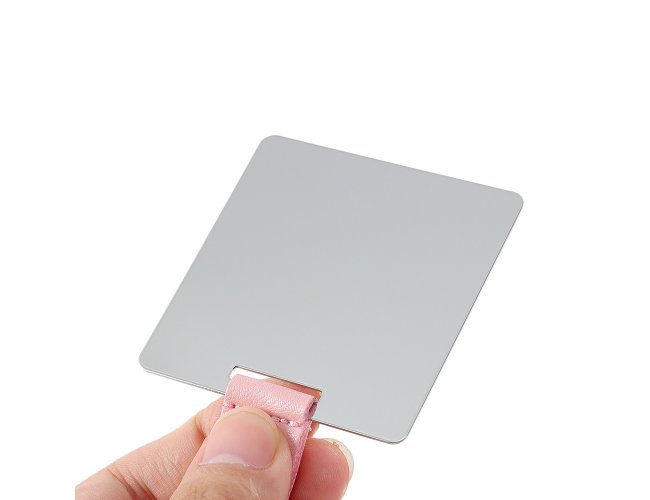 Espelho inquebrável de aço inoxidável ultra fino com verso escovado e alça em couro sintético. Acompanha estojo de couro sintético.
