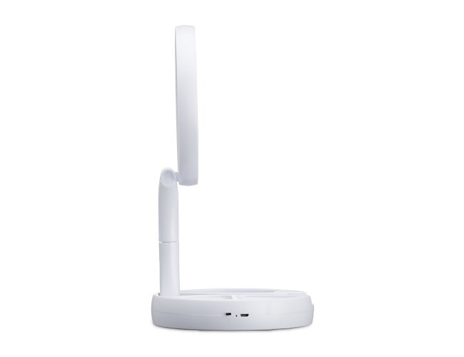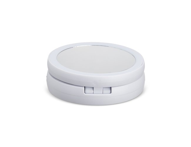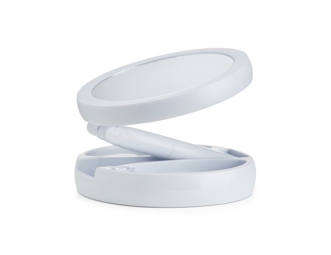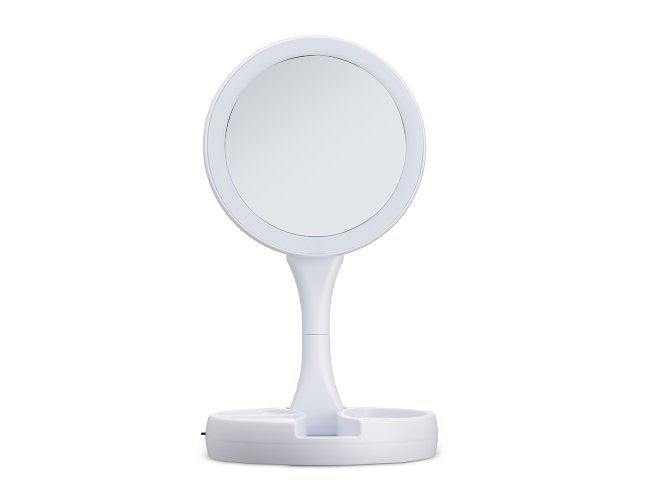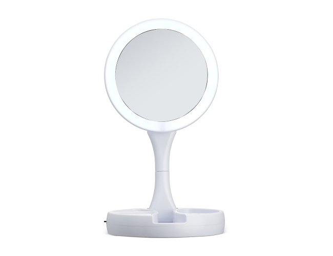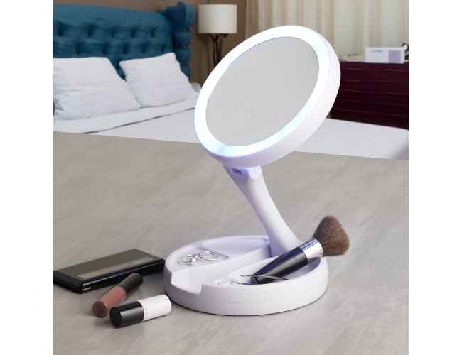 Espelho Dobrável com LED e dupla face, material plástico. O espelho possui uma das faces ampliada 10x e do outro lado, espelho convencional 1x, iluminação LED dos dois lados, três compartimentos na base para armazenamento de acessórios, espelho giratório e regulável, botão liga/desliga e botão para acionar a iluminação, com funcionamento à base de 4 pilhas AA (não acompanha) ou via cabo USB.