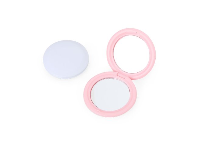 Compacto e funcional, este espelho duplo de bolso é produzido em material plástico. Seu design diferenciado conta com centro plano e bordas em declive, proporcionando um acabamento moderno e elegante.