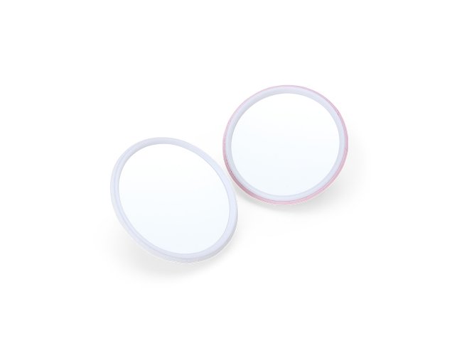 Espelho plástico sem aumento com verso de acabamento brilhante e película de ferro.