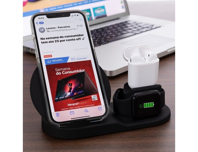 Revolução em carregador sem fio! A nossa Estação de carregamento 3 em 1 é uma opção ideal para recarga de smartphones, iWatch ou Apple Watch e fones de ouvido Airpods. Feita em plástico ABS resistente, possui sistema de carga por indução rápida, permitindo o carregamento sem fio de dispositivos habilitados com estas tecnologias, conhecida como QI. além destes suportes, a estação conta ainda com um carregador para fones estilo airpods através do conector Lightning. Sua base contém tapetes de silicone antiderrapantes e frestas inferiores para auxiliar na dissipação de calor durante o carregamento dos aparelhos. Acompanha cabo USB-C.
