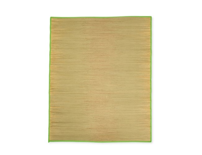 Esteira leve em palha sintética com bordas costuradas em nylon. Acompanha saco de nylon com seção telada, cordão de fechamento e alça regulável para transporte.