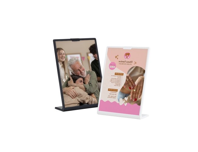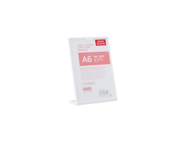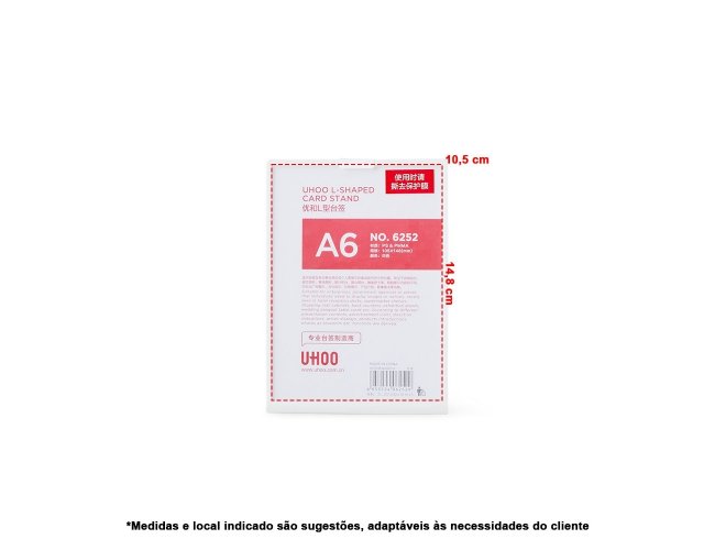 Expositor porta retrato A6 feito em poliestireno com placa acrílica.