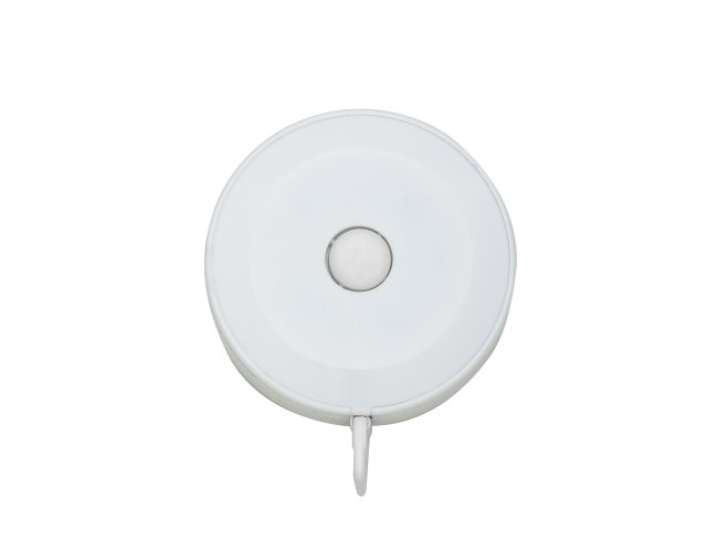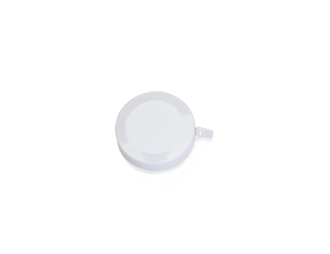 Fita métrica de formato circular em plástico com fita flexível em PVC e fibra de vidro com marcação em dupla face, puxador de plástico na ponta externa, botão de trava/destrava e alcance máximo de 1,5 metro.