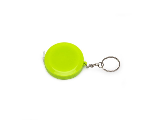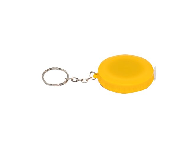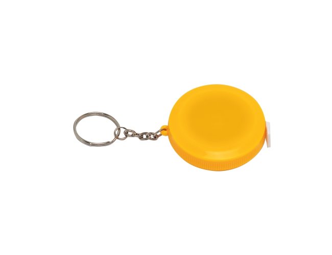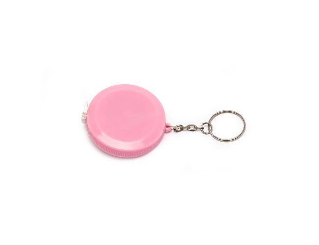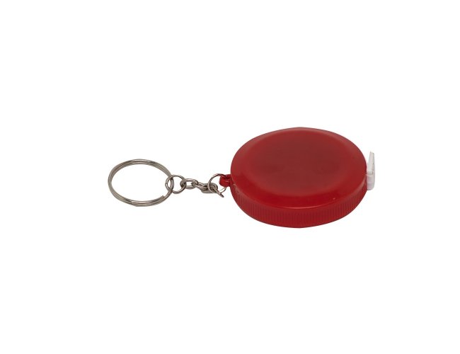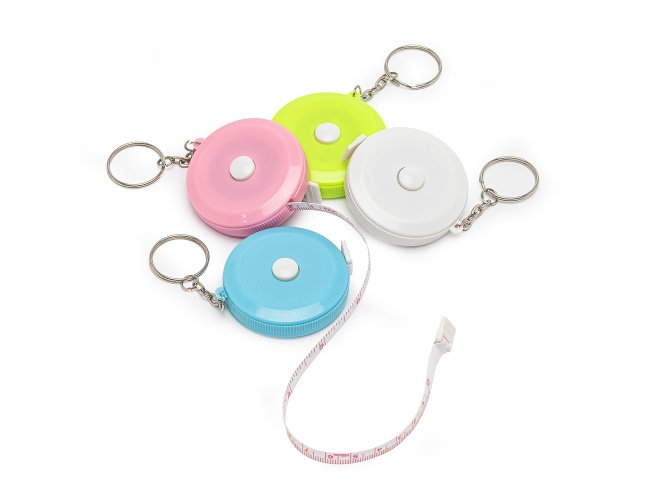 Fita métrica de 1,50 metro em plástico redondo, frente lisa e verso com botão (trava). Acompanha chaveiro.