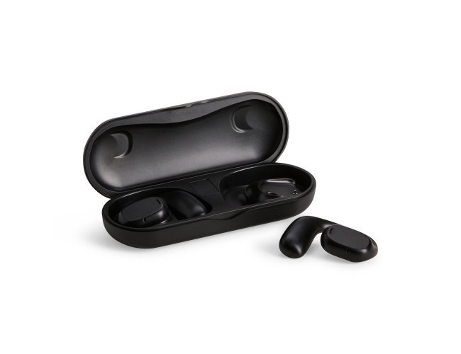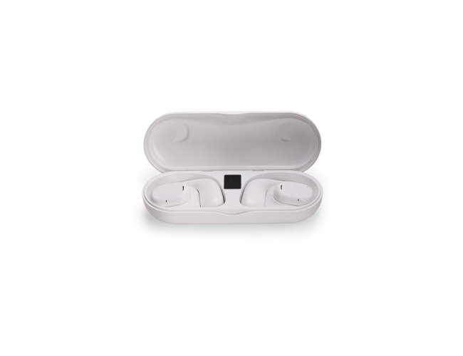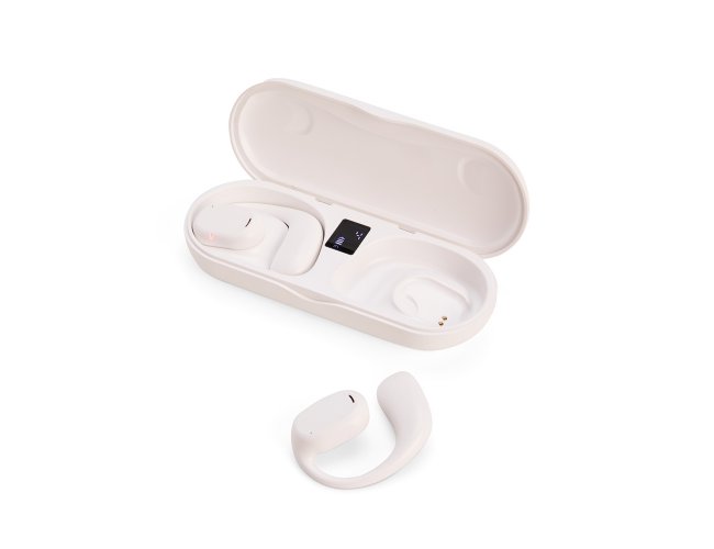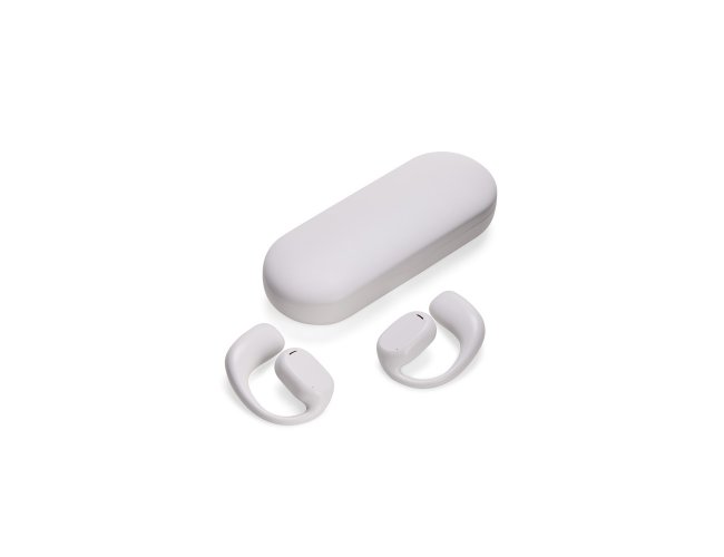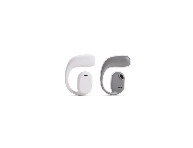 Fones de ouvido sem fio com estrutura em plástico. Possuem formato aberto e ergonômico, permitindo o encaixe nas orelhas sem entrar em contato direto com o canal auditivo. Apresenta conexão via Bluetooth 5.3 que oferece uma transmissão de dados mais estável e com maior qualidade. Acompanha estojo de carregamento com visor de percentual da carga total, além de cabo USB-C para recarga.