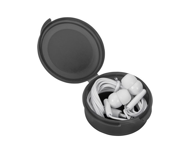 Fone de ouvido intra-auricular, caixinha redonda de material plástico fosco inteiro colorido.