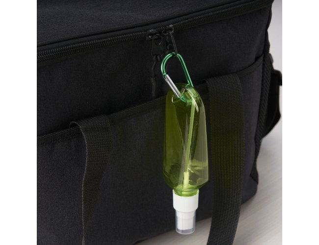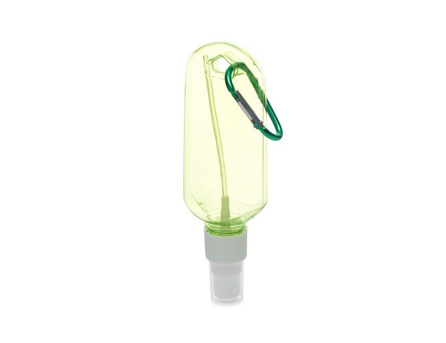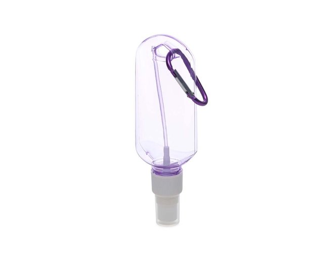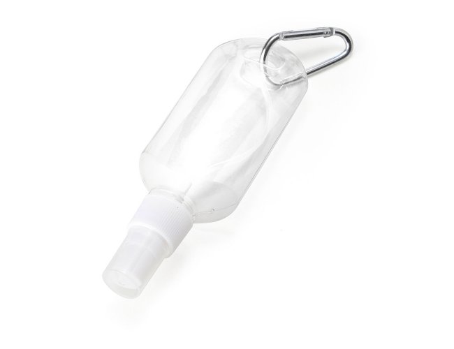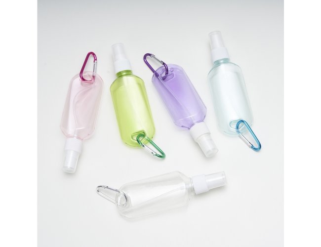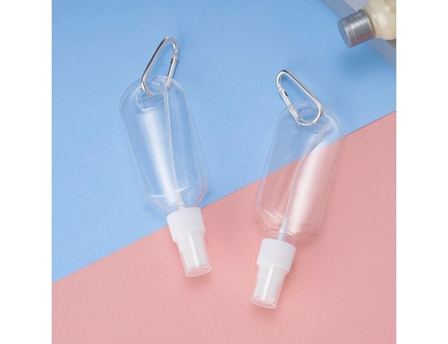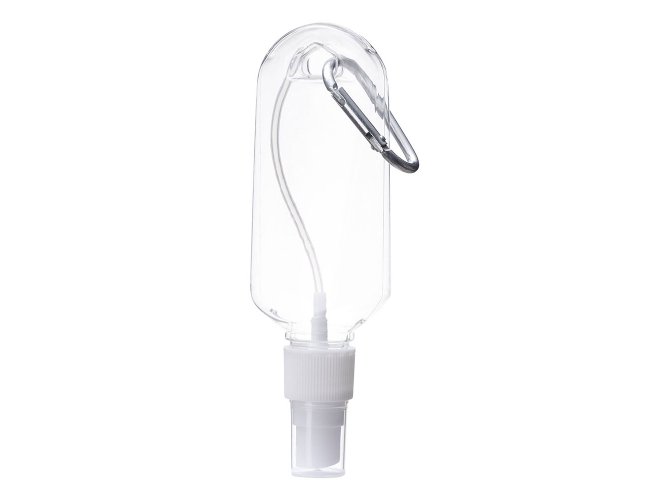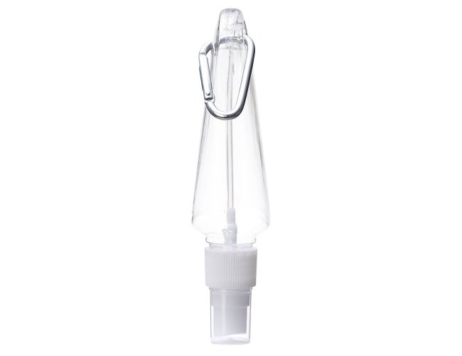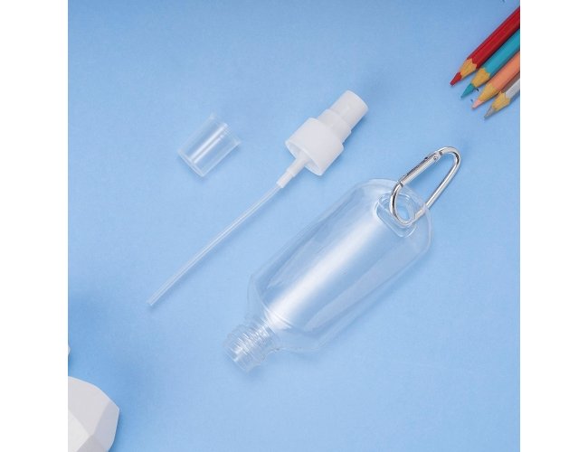 Frasco plástico spray com capacidade de 100ml, contém tampa branca com encaixe rosqueável e acompanha chaveiro mosquetão para transporte.