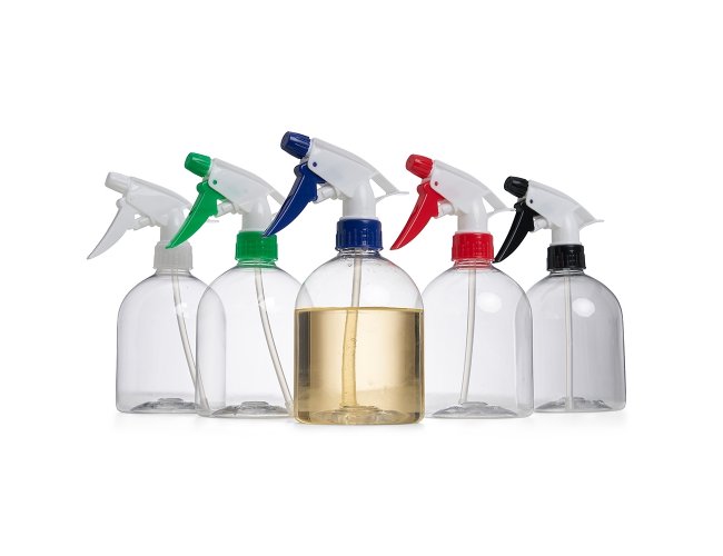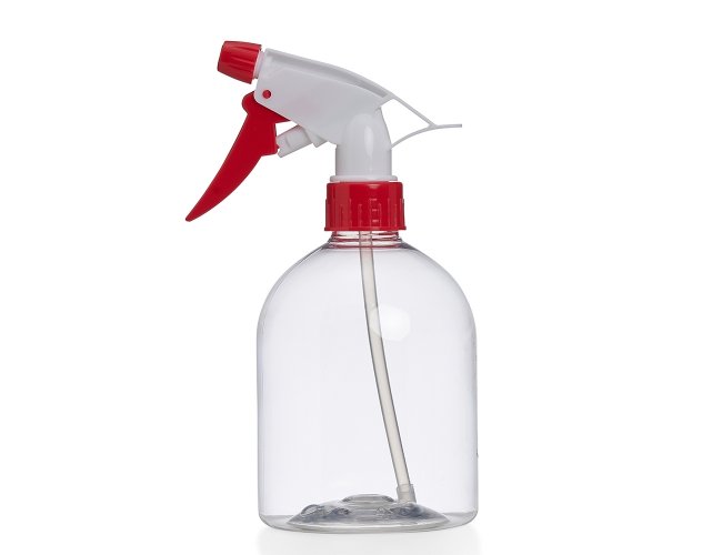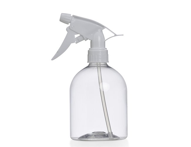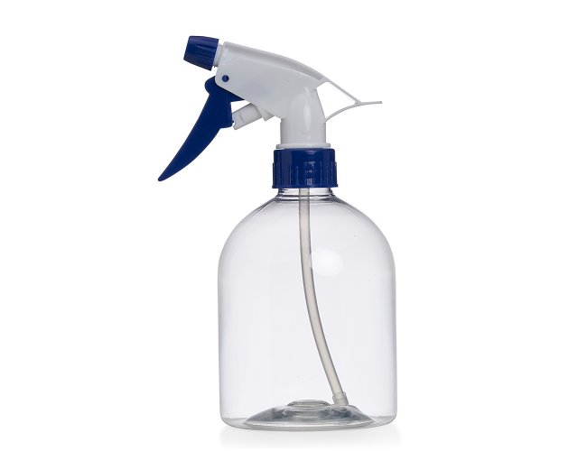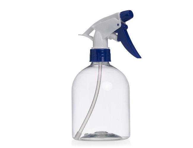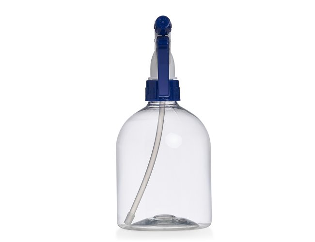 Frasco plástico de 500ml com válvula de spray e sistema de regulagem, ao rotacionar a ponteira é possível regular entre os modos: jato, spray e trava da válvula.