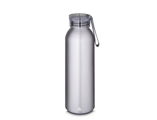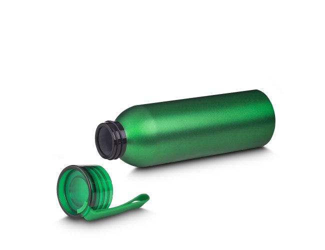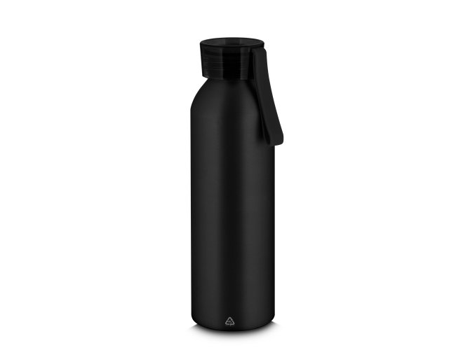 Garrafa de alumínio reciclável com capacidade para 640ml, possui tampa rosqueável de plástico e alça emborrachada
