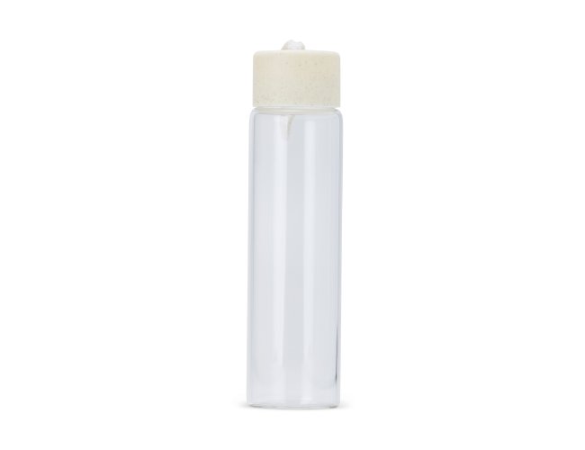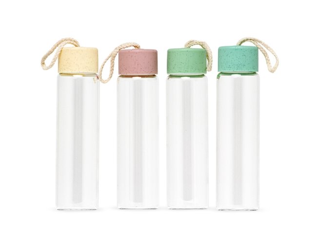 Garrafa de vidro 330ml com tampa plástica e alça de algodão para transporte.