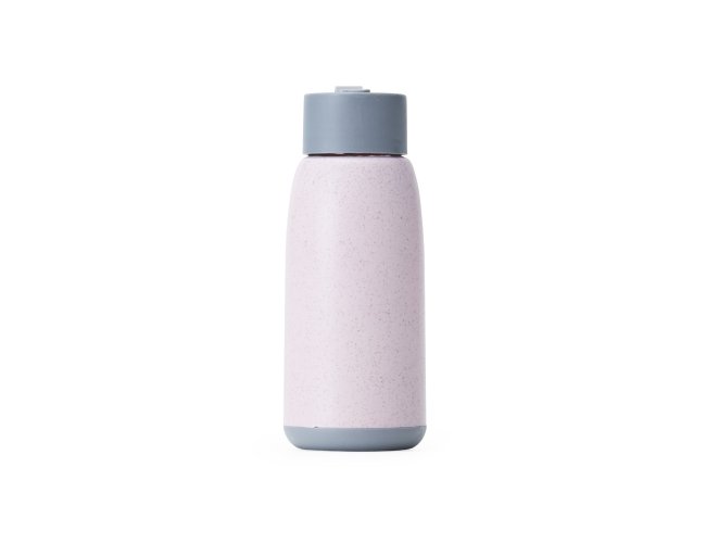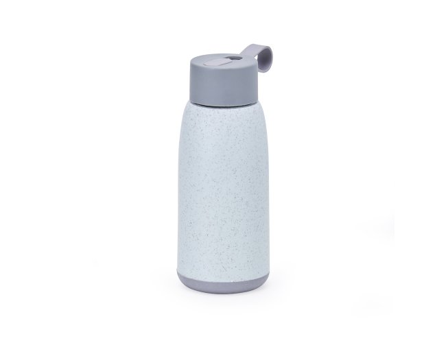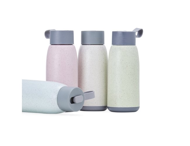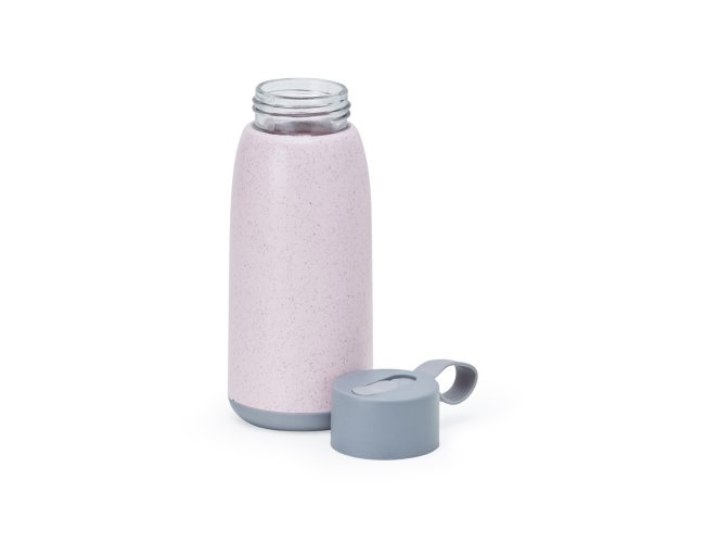 Garrafa de vidro 350ml com revestimento plástico, tampa plástica com alça de silicone.