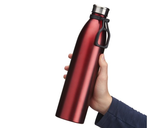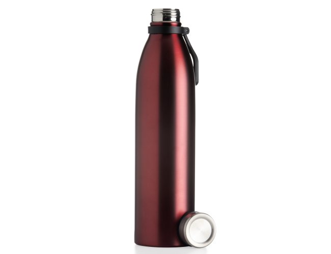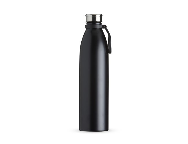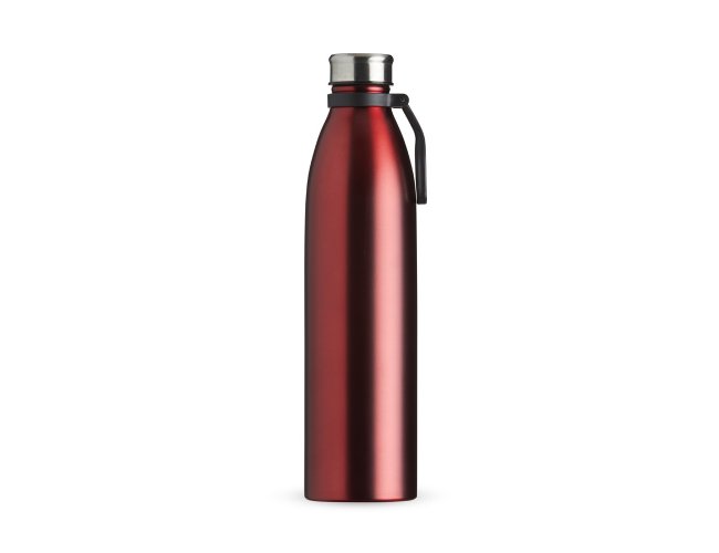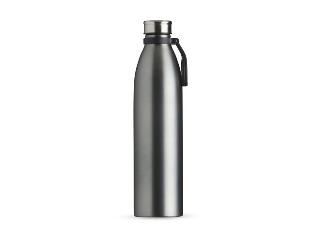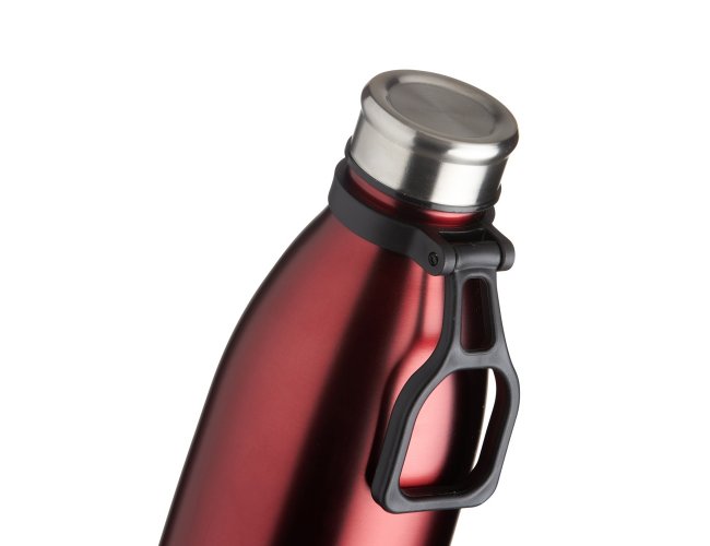 Garrafa de inox 1,1 litros com tampa rosqueável e alça plástica para transporte.