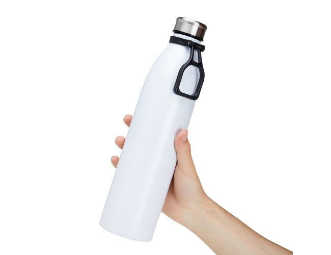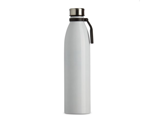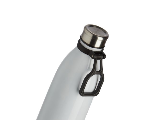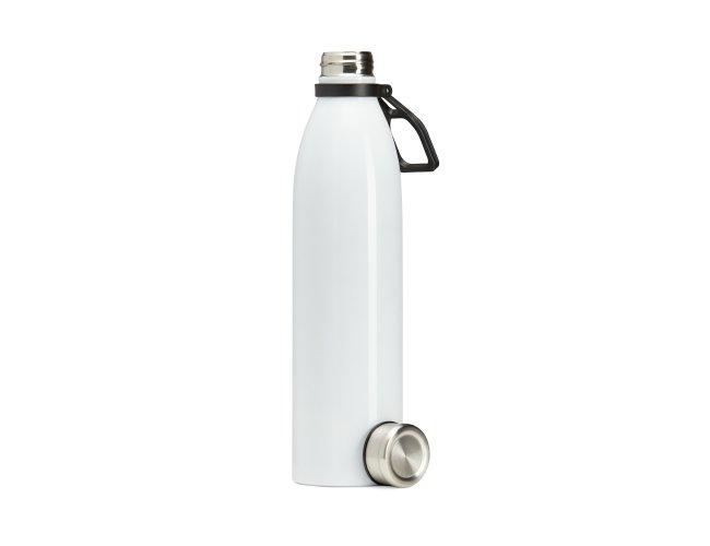 Garrafa de inox 1,1 litros com tampa rosqueável e alça plástica para transporte.