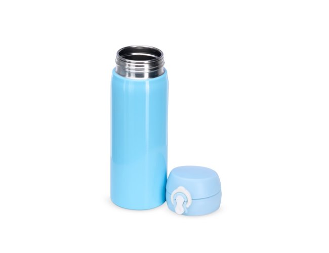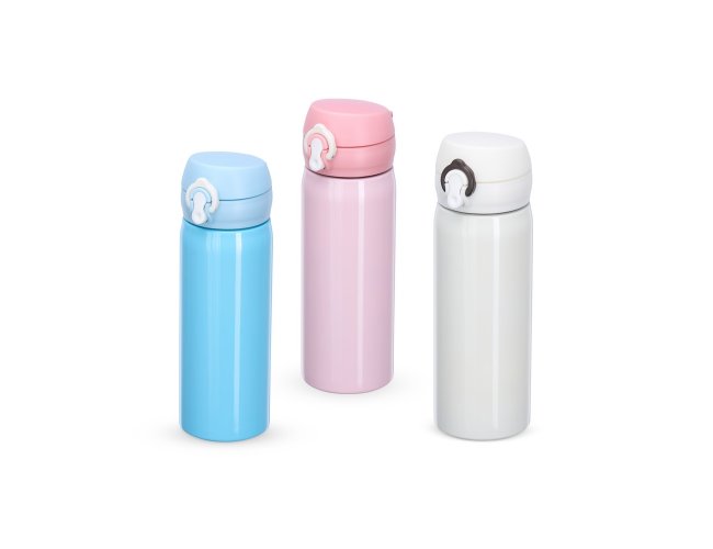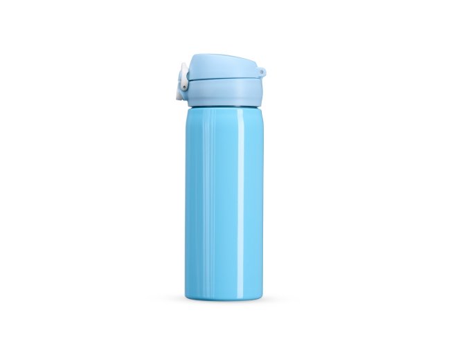 Garrafa 500ml em inox com botão e válvula para abertura. Possui um sistema de trava (basta mover para cima/baixo para abrir/fechar) pressione o botão central para abrir a tampa.