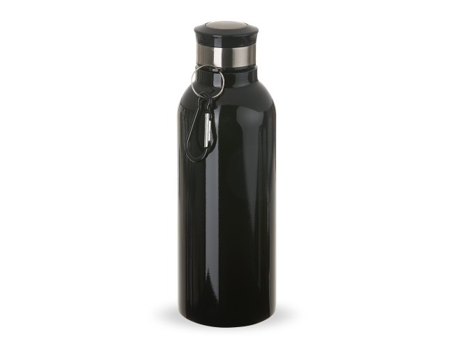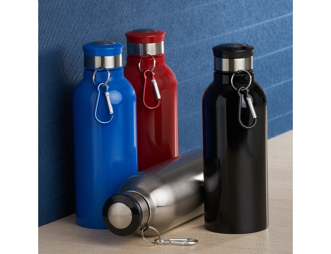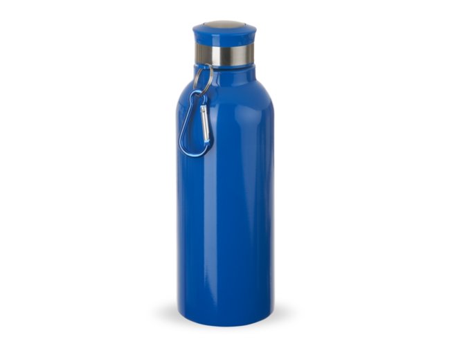 Garrafa Inox 700ml com pintura colorida e detalhes em prata. Possui tampa rosqueável e acompanha chaveiro mosquetão.